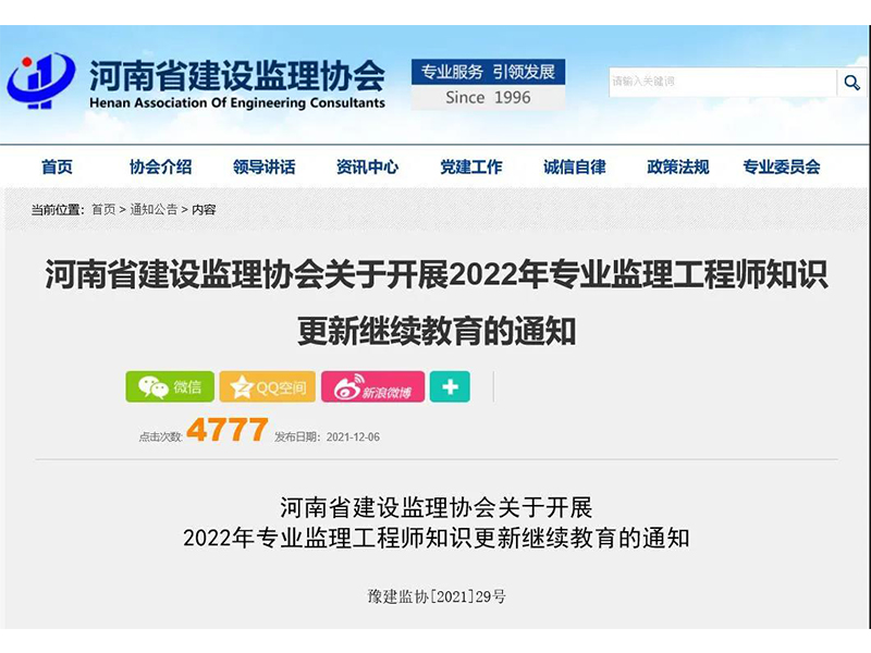 【通知公告】河南省建设监理协会关于开展2022年**监理工程师知识更新继续教育的通知详情>>